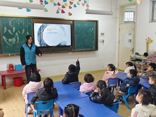 活动伊始,志愿者首先借助精心制作的PPT课件,以童趣的语言和生动的图片,为小朋友讲解雪花的形成原因、六边形的形状特征等冬季雪景知识,带领孩子们在趣味科普中解锁冬日自然奥秘,点燃他们探索冰雪世界的好奇心。随后,志愿者组织开展“萝卜蹲”冰雪主题小游戏,将“雪花蹲”“雪人蹲”等与冬日元素结合,小朋友们分组参与、轮流喊口令做动作,不仅锻炼了反应能力,更沉浸式感受了冬日的独特魅力。游戏结束后,志愿者还结合PPT内容,为小朋友讲解雪中玩耍的安全注意事项,提醒大家享受冬日乐趣的同时保护好自身安全,让孩子们在欢乐中收获知识与安全常识。