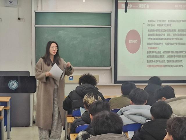 李佳雯紧扣计算机科学与技术专业培养方向与基层岗位实际需求,对西部计划政策进行了全面、细致且贴合学生实际的解读。讲解结合基层实际工作案例,重点聚焦数字乡村建设、基层信息化运维、网络安全保障等与计算机科学与技术专业高度匹配的服务岗位,帮助同学们清晰认识到程序开发、数据库管理、系统运维等方面的专业知识可在西部基层治理、乡村数字化升级、政务信息化建设中发挥重要作用。同时,李佳雯围绕服务期间的生活补贴、社会保险、免费住宿等保障政策,以及服务期满后考研初试加分、保留应届毕业生身份、公务员定向招录、工龄计入等同学们关心的内容展开说明,用通俗易懂的语言拆解政策细节,有效解答了同学们对西部生活、职业发展的诸多疑惑。