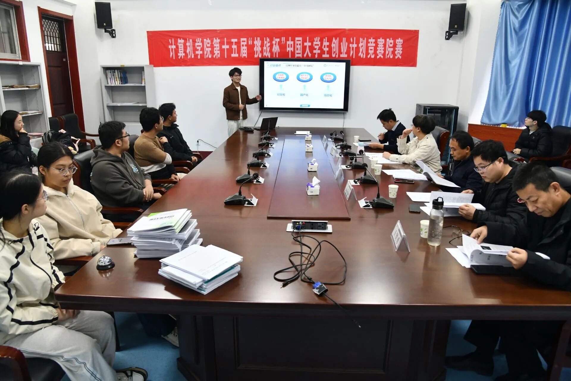 为激发青年学生科技创新热情,培育实践型技术人才,11月28日,计算机学院于10号楼A408举办第十五届“挑战杯”中国大学生创业计划竞赛院赛。本次竞赛特邀计算机学院副院长贾保先担任评委,学院教师王贤勇、孟磊磊、包云、李因伟共同组成评审团,为赛事提供专业指导与点评。
